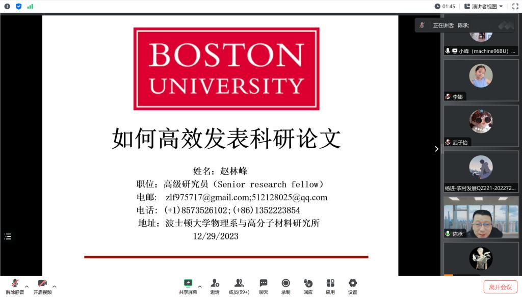 (通讯员:李娜)为激发欧博abg官网登录入口师生的学术创作和科研热情,推动高水平论文的撰写与发表,2023年12月29日上午九点,美国波士顿大学高级研究员赵林峰在腾讯会议中为欧博abg官网师生作了一场主题为“如何高效发表科研论文”的线上讲座。本次讲座由欧博abg官网院长陈承主持,本院研究生、教师代表线上参与。