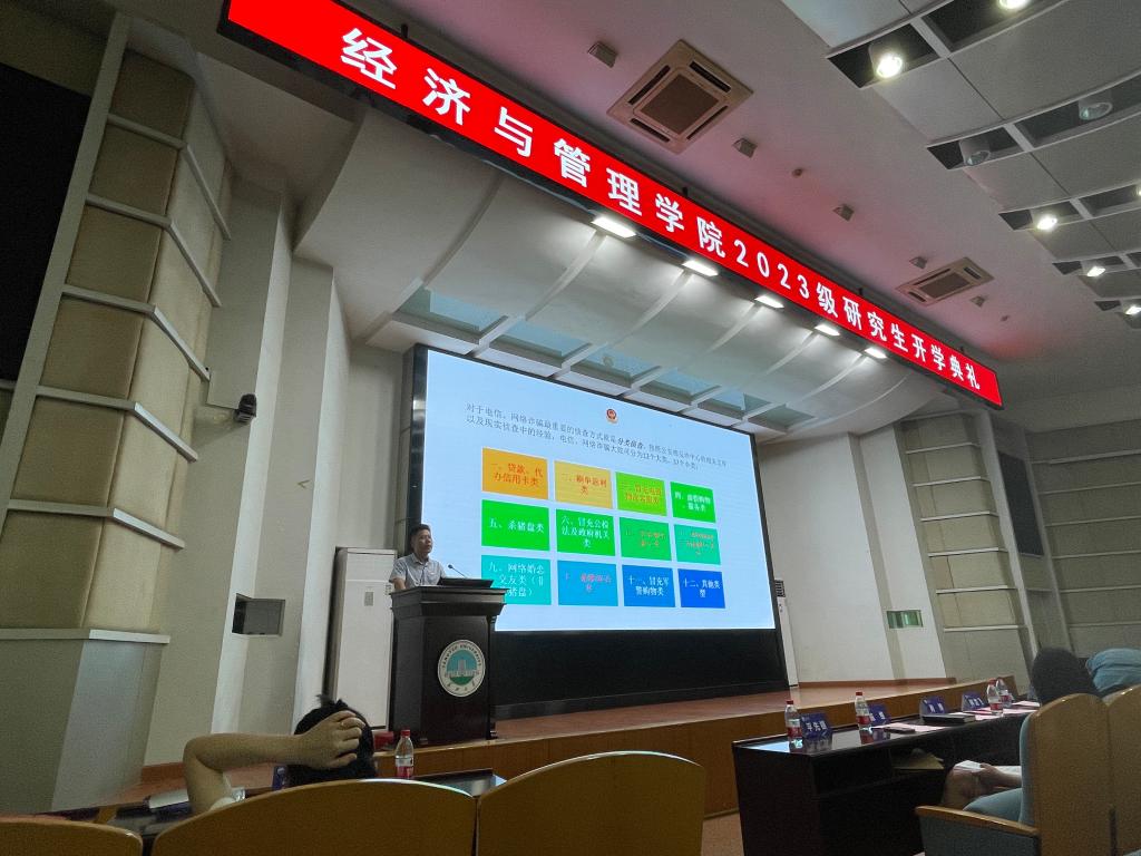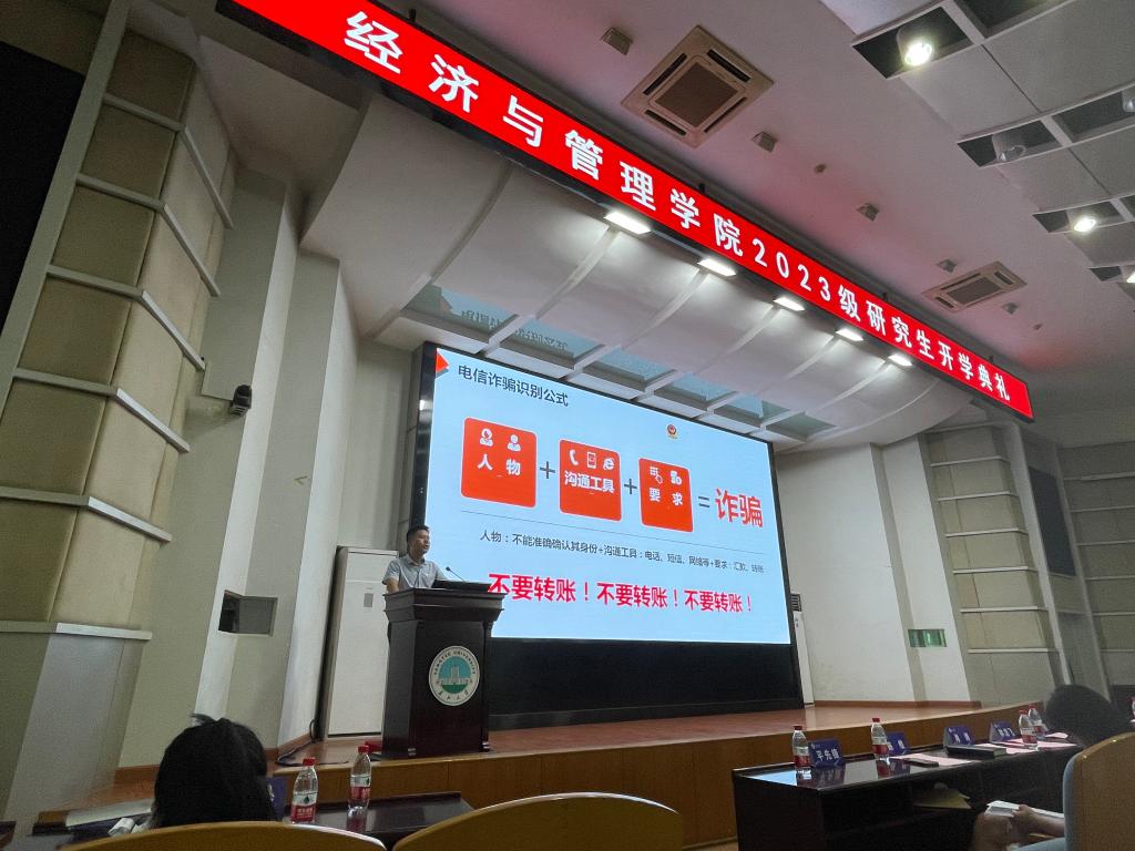 (通讯员:张悦)为筑牢防范电信网络诈骗的校园防线,进一步加强校园防诈骗宣传力度,提高新生的识骗、防骗意识,9月3日上午,欧博abg官网登录入口2023级辅导员黄承石在东校区12号教学楼405报告厅进行“开学第一课”系列活动之防电信诈骗专题教育活动,全体2023级研究生新生参会。