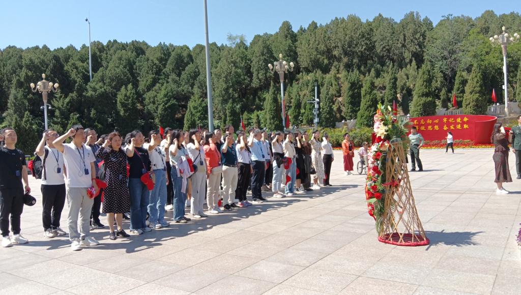 全体教职工党员在西柏坡纪念广场向五大书记铜像敬献花篮。在党委副书记王中梅的带领下,全体教职工党员集体重温入党誓词,齐唱国歌。