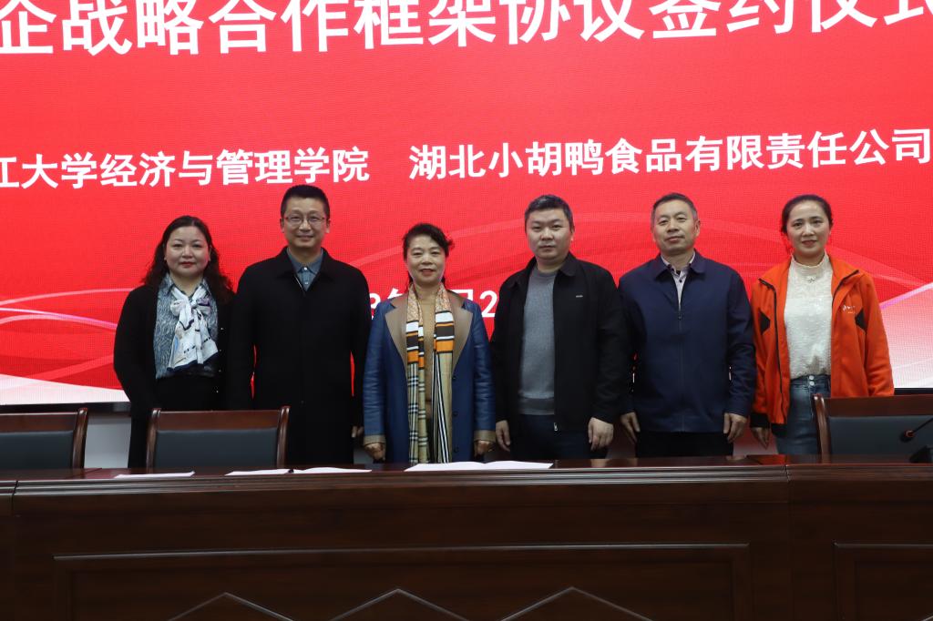 (通讯员 黄胜胜 彭文桦)2023年4月27日,欧博abg官网登录入口与湖北小胡鸭食品有限责任公司校企战略合作框架协议签约仪式在学校15教学术报告厅举行。小胡鸭董事长胡秀容,董事长助理陈思才,党支部书记陈海燕,宣传部长姚瑜出席签约式,学院院长徐辉,副院长陈承,副书记王中梅及学院25名教师代表,200名学生代表参加签约仪式及励志报告会。