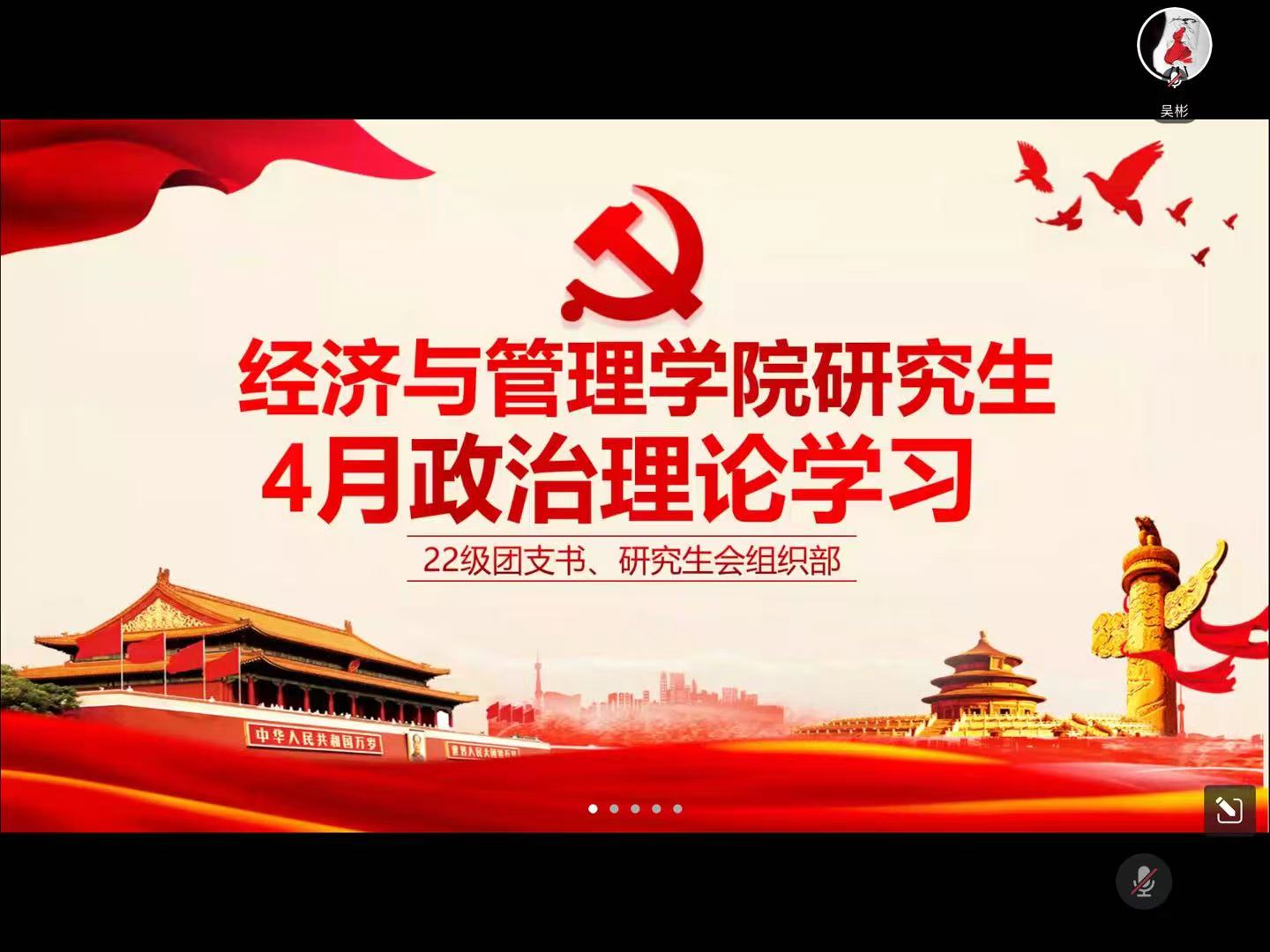 (通讯员:吴彬)为丰富研究生学习生活,加强对政治理论知识的掌握,4月20日晚7点,欧博abg官网登录入口通过腾讯会议开展四月政治理论学习活动。本次活动由研究生会组织部及22级团支书组织,全体研究生参与活动。