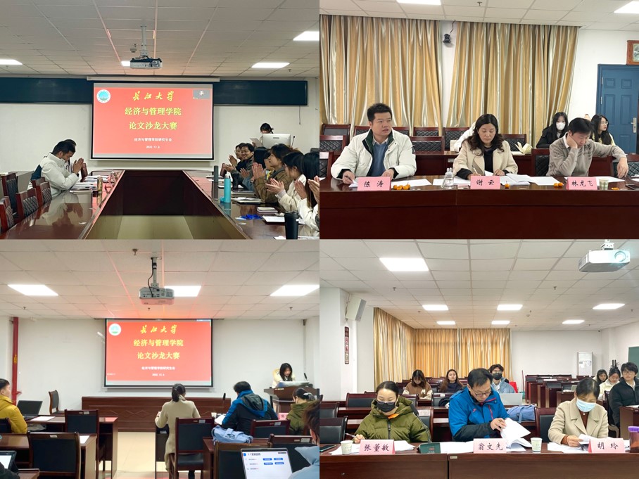(通讯员:张悦、付玉婷)12月6日上午9时,欧博abg官网于文科楼505、605会议室举行2022年研究生学术沙龙大赛,本次大赛分为经济场和管理场,采取线上线下相结合的方式进行。大赛邀请到谢云副教授、林龙飞副教授和陈涛老师担任经济场评委,翁文先副教授、胡玲老师、张董敏老师担任管理场评委,裴潇副院长、辅导员朱翠玲老师、黄承石老师受邀参会。