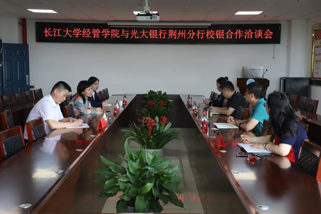 (通讯员 彭蓉)4月25日下午,中国光大银行荆州分行总部一行三人来访,在文科楼505会议室召开了校银合作洽谈会。中国光大银行荆州分行行长徐静、副行长王力军、零售部总经理钟毅,经管学院院长徐辉、副院长陈承、学院党委副书记王中梅、学院办公室主任彭蓉参加了此次座谈。
