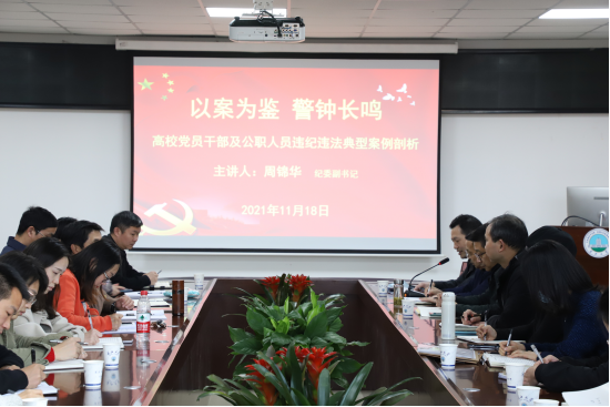 周锦华副书记以《以案为鉴 警钟长鸣》为题进行了宣讲,通过对高校党员干部及公职人员违纪违法典型案例的剖析和案发后的处理,来警示大家一定要守住底线,牢记作为一名共产党员的初心。