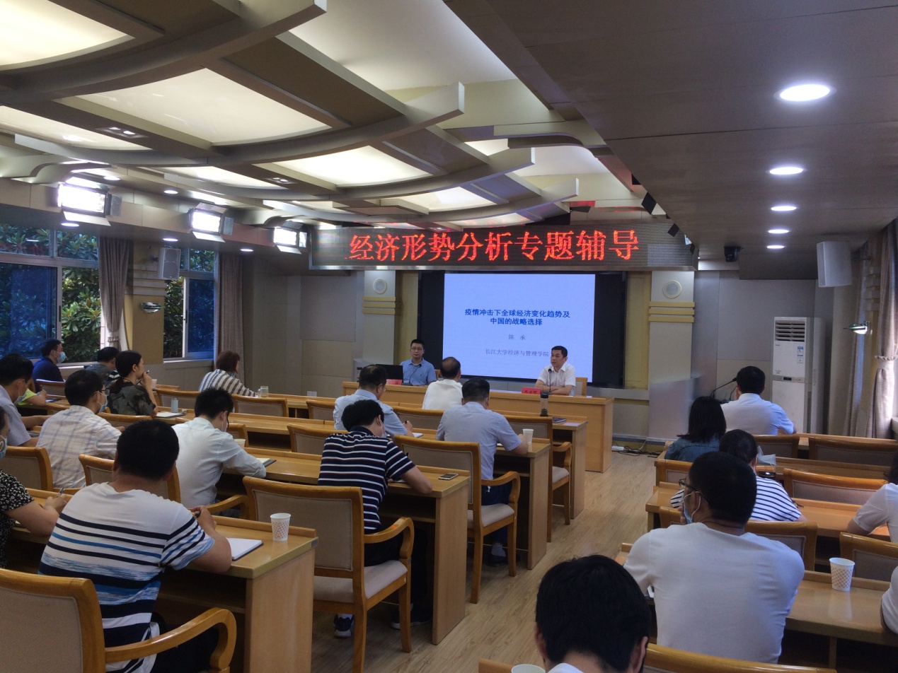 (通讯员 黄胜胜)为了更好的服务荆州市地方经济社会发展,促进荆州市疫情防控常态化趋势下更全面有效的复工复产复学。2020年7月17日下午,受荆州市政府办公室邀请,欧博abg官网登录入口副院长陈承教授作了《疫情冲击下全球经济变化趋势及中国的战略选择》主题报告。会议由荆州市政府副秘书长朱启明主持,荆州市政府办公室、市政府研究室部分领导班子成员、全体机关干部和系统单位负责同志聆听了此次报告。