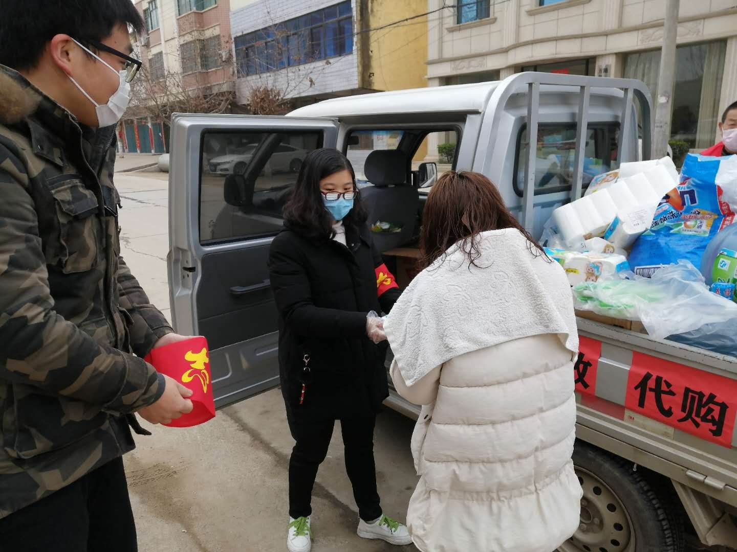 村委会经过一致协商,从2月7日起,每隔三天就帮村民们统一采购一次物资。吴梦怡主动担任四组物资采购的组长,每天早晨8:00就开始在微信群(物资采购)开始统计村民们的物资需求信息,中午 12:00汇总好相应的物资的信息后便随同大卡车去镇上采购物资,往返需要半天的时间,返回村里时已是下午18:00。第二天赶早就将物资清点好,给村民们挨家挨户发放物资。物资的清点和发放工作很繁琐,并且由于疫情期间物资匮乏,村民们的需求得不到很好的满足,但是吴梦怡和其大学生志愿者团队尽可能地去更好地满足大家的需求,去贡献自己的一份微薄之力。