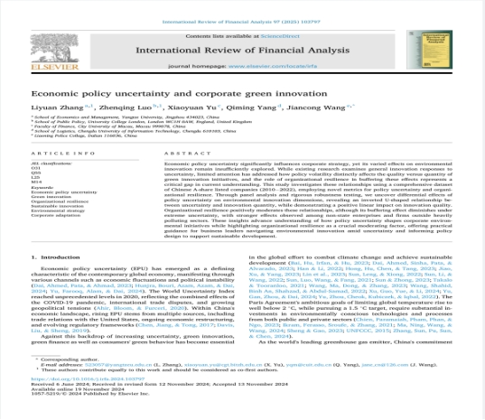 (通讯员:马晓娜)欧博abg官网登录入口张力元老师(第一作者)与合作者的论文《Economic policy uncertainty and corporate green innovation》在国际知名期刊《International Review of Financial Analysis》(简称IRFA)发表。