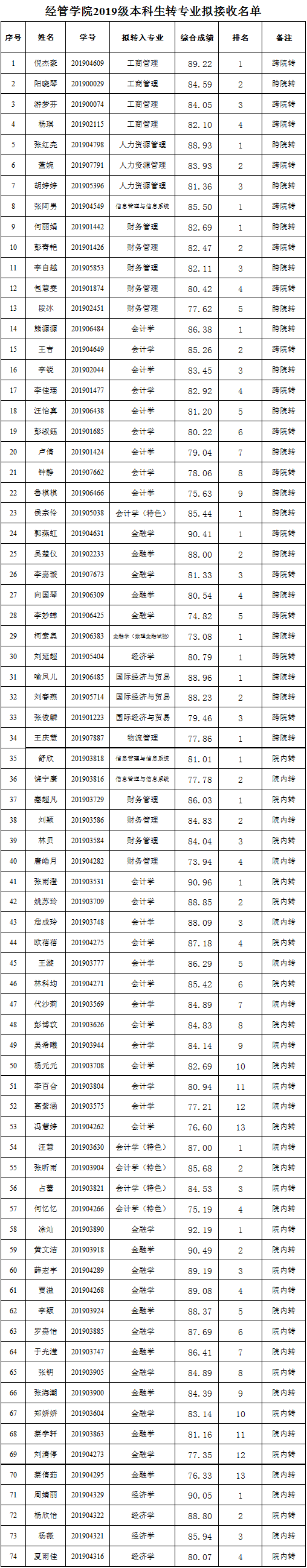 根据《欧博abg官网登录入口普通本科生专业分流与转专业管理办法(试行)》(长大校发〔2019〕260号)文件以及教务处《关于疫情防控期间2019级普通本科生转专业工作的通知》要求,结合经管学院2019级本科生转专业工作方案的具体安排,欧博abg官网于7月11日上午组织了对拟转入学生的在线面试。综合学习成绩与面试成绩,经欧博abg官网党政联席会讨论通过,现将拟接收名单公示如下: