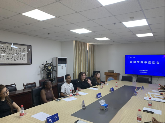 (通讯员 马晓娜)为进一步做好本科留学生培养工作,5月28日下午15:00,经管学院在文科楼516会议室召开留学生期中座谈会。城建学院王德玲教授,经管学院童伟伟教授、朱瑞海副教授、曾靖副教授,国际学院教学办王莹老师,经管学院教学办主任彭德春、教学秘书马晓娜、雷宇老师参加了座谈会,参会的5名留学本科生分别是来自厄瓜多尔的凯瑟琳、波兰的莉娅、卢旺达的IRIHO INGRID、孟加拉国的阿纳夫,哈萨克斯坦的佳宁,座谈会由彭德春主持。
