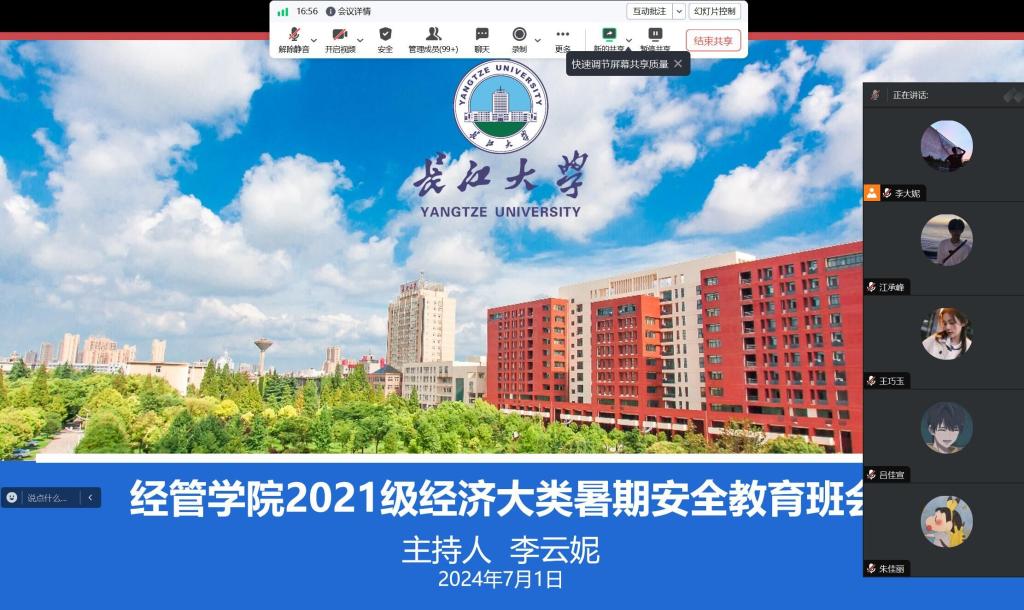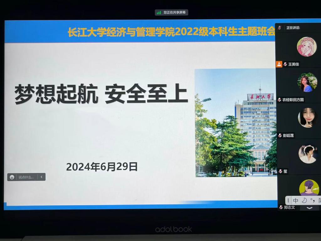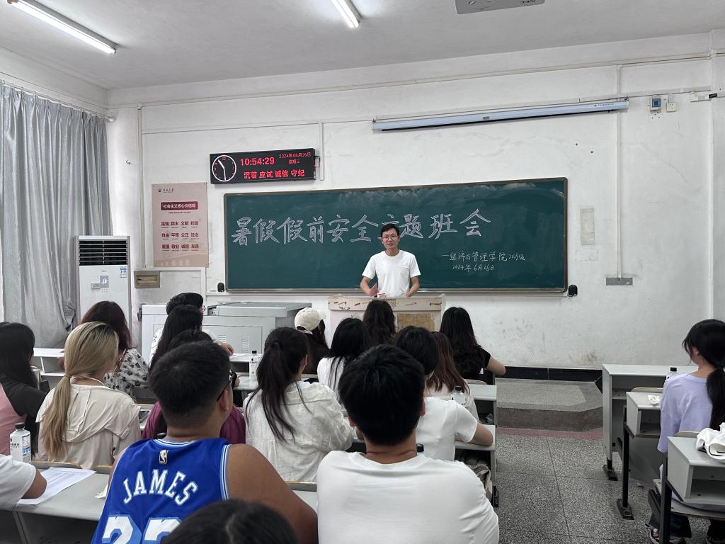 学院的全体学生,以班级为单位组织开展假期安全教育主题班会。班会首先明确告知大家放假时间,提醒同学们做好假期规划;然后从安全观念、宿舍安全管理、暑期留校审批、留校学生管理等多方面多维度进行了重点强调,进一步加强安全宣传和健康引导,增强学生的安全防范意识。
