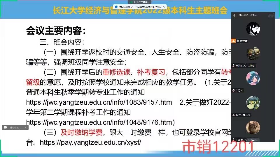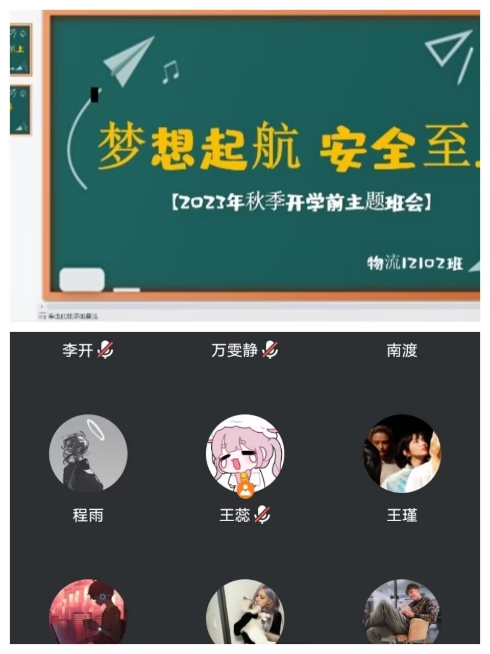 会议开始,首先由班主任强调了返校时间,如遇特殊情况推迟返校需向辅导员请假报备;全体同学要重视返校人身安全,谨防电信诈骗;随后针对不同年级的学生,开展了学业教育,新生班主任表示希望同学们可以尽快适应大学生活,要抓紧时间,争取在新的学习生涯中取得优异的成绩;毕业年级班主任强调要处理好课程修读与考研、就业的关系,关注自身学业状态,确保能顺利毕业;其他低年级学生要不断总结,奋发向上,以最佳的状态投入到新学期的学习中去。