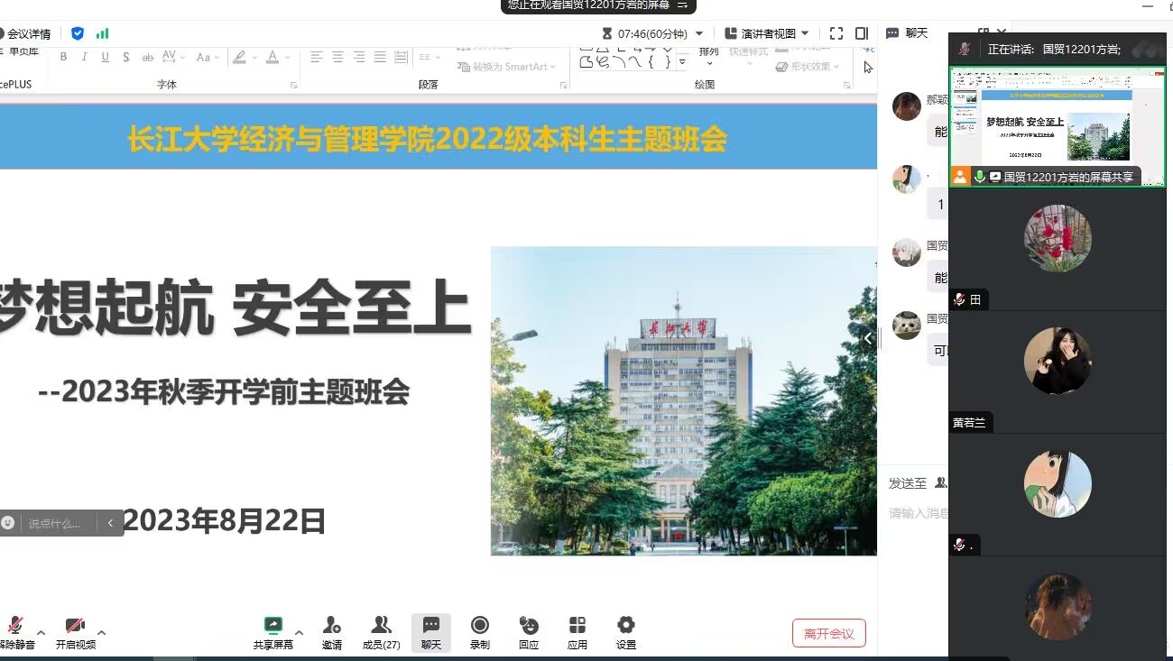 为确保秋季学期开学工作平稳有序,根据学校相关通知要求,欧博abg官网登录入口在新学期伊始,组织全院所有班级开展了2023年秋季学期第一次线上班会,班会的主题为“梦想起航 安全至上”。学院学工办对班会的开展进行了统筹安排,所有辅导员和班主任都积极参与其中,结合各年级学生的特点,对相关事项进行提醒和说明,为学生新学期的学习生活和师生沟通奠定良好基础。