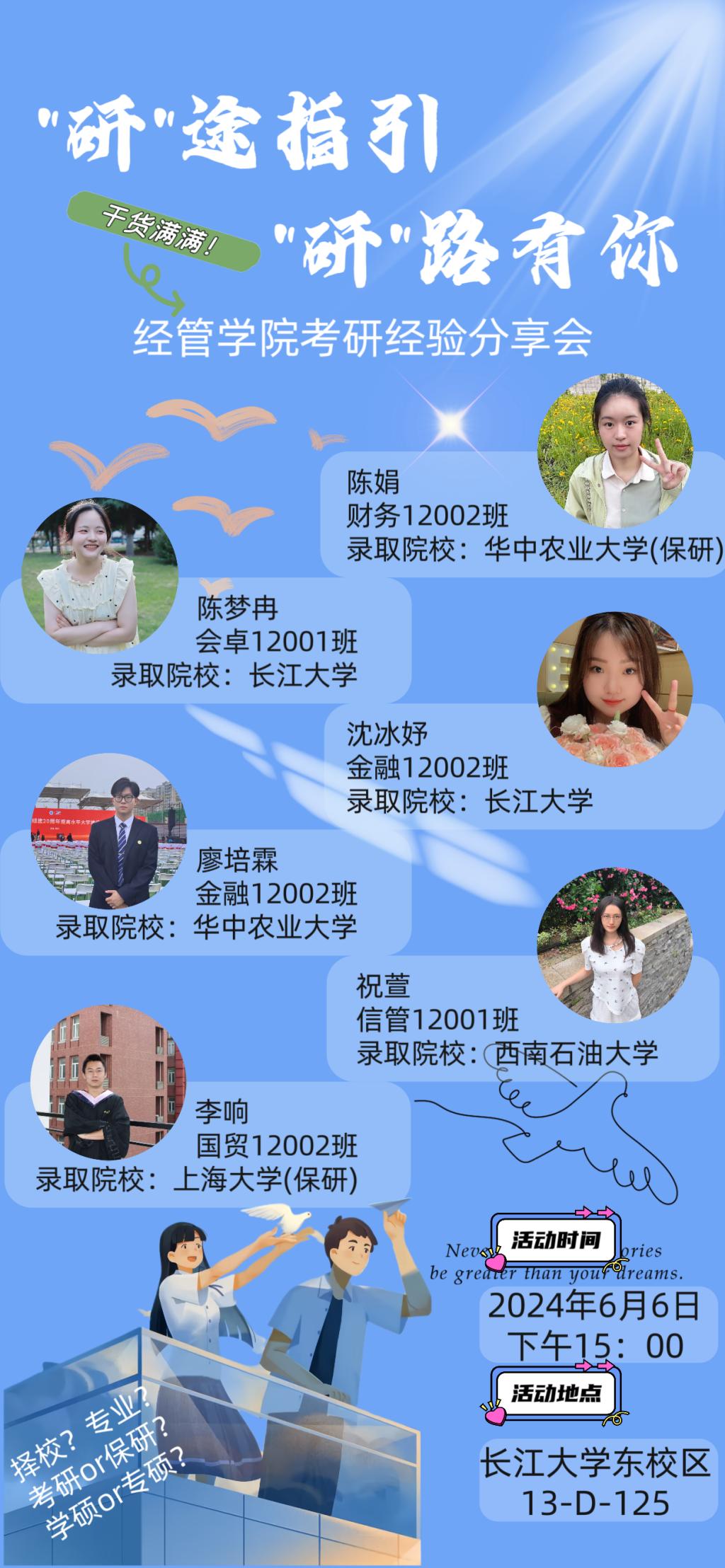 (通讯员 单子浩)为助力欧博abg官网登录入口学子了解考研形式,进一步明确考研规划。2024年6月6日下午,经管学院开展“研”途指引、“研”路有你——考研经验分享会。本次分享邀请了2024届升学上岸学子陈娟、陈梦冉、沈冰妤、廖培霖、祝萱、李响,2022级辅导员桂凯丽、方含之和2022级、2023级学生参加。