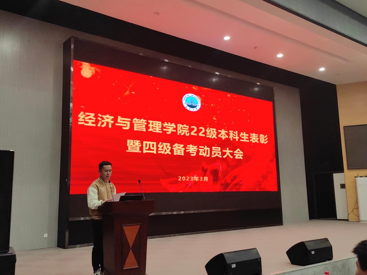 (通讯员:董梦娜)为展示欧博abg官网优秀学子朝气蓬勃的精神风貌,助力英语四级考试,传授经验和答疑解惑,提升大学英语四级考试通过率,3月23日下午2点,欧博abg官网在农科大楼1058报告厅举行22级本科生表彰暨四级备考动员大会,院党委副书记王中梅老师、学工班主任叶星老师、团委书记李博老师以及2022级全体学生共同参会,大会由辅导员方含之老师主持。