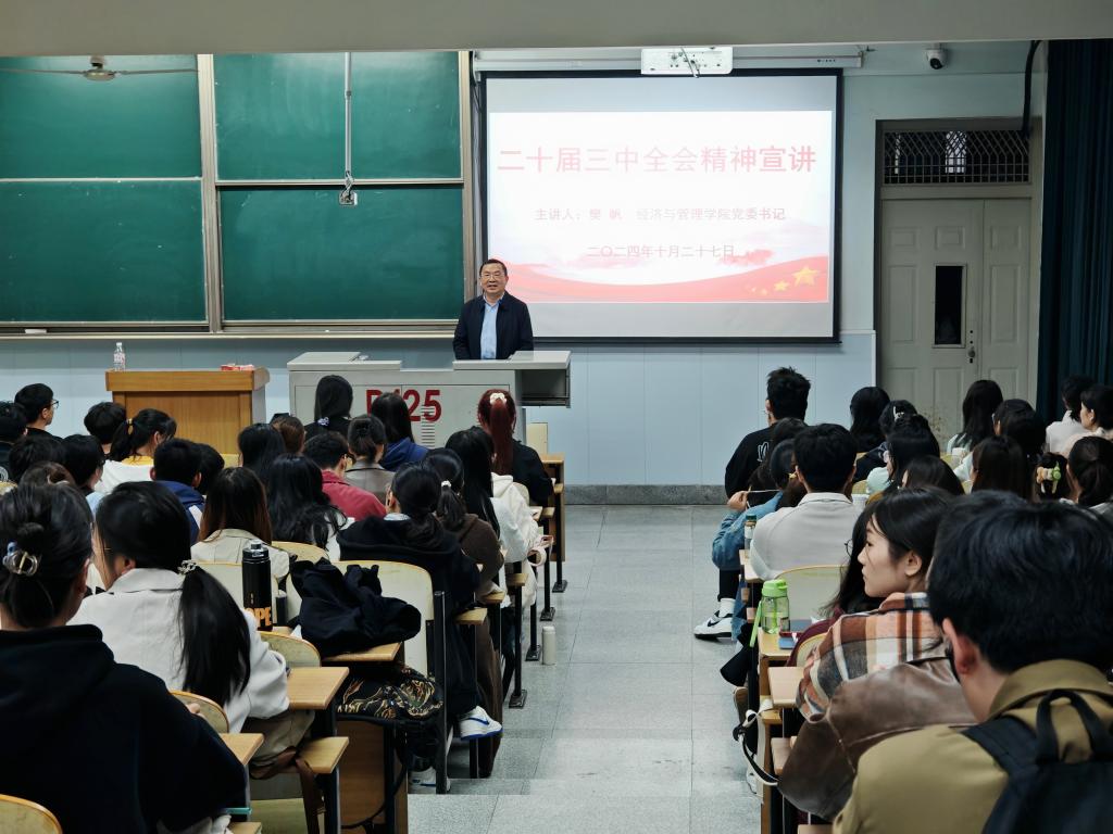 (通讯员 李云妮)为深入学习贯彻党的二十届三中全会精神,加强党员的集中学习教育,近日,欧博abg官网登录入口开展党的二十届三中全会精神宣讲会,学院党委书记樊帆为全体学生党员作党的二十届三中全会精神宣讲报告。