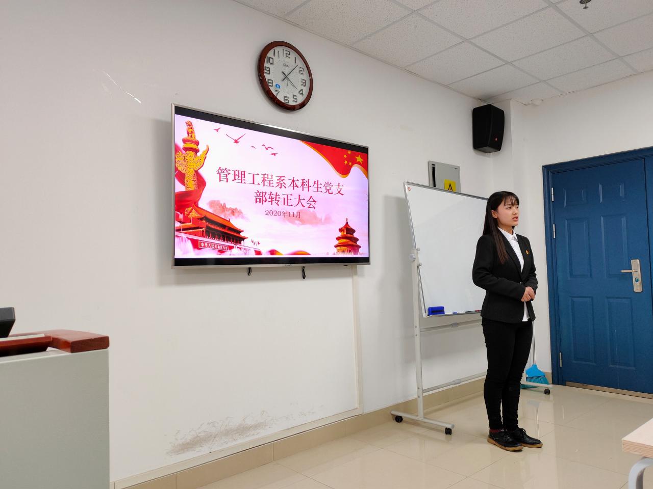 (通讯员 张洋)2020年11月26日下午16点,欧博abg官网登录入口管理工程系本科生党支部于文科大楼417召开了预备党员转正大会。由于疫情原因,黄芊同志以线上腾讯会议的方式同步参会。会议讨论关于黄芊等4位同志按期转正的问题。参会人员有党支部书记李博老师、6位正式党员与19位预备党员。本次会议由陆媛主持。