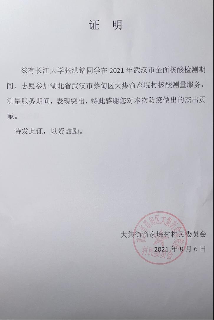 武汉,这座英雄的城市,再次发现新冠的踪迹。为此,全市展开了为期三天的全员核酸检测。8月5日至8月6日,欧博abg官网2020级会计12001班张洪铭同学利用暑假积极做好疫情防控宣传工作的同时,还承担核酸检测录入工作,作为武汉市蔡甸区的新青年,作为一名光荣的预备党员,对每一天的工作都一丝不苟,充满激情。