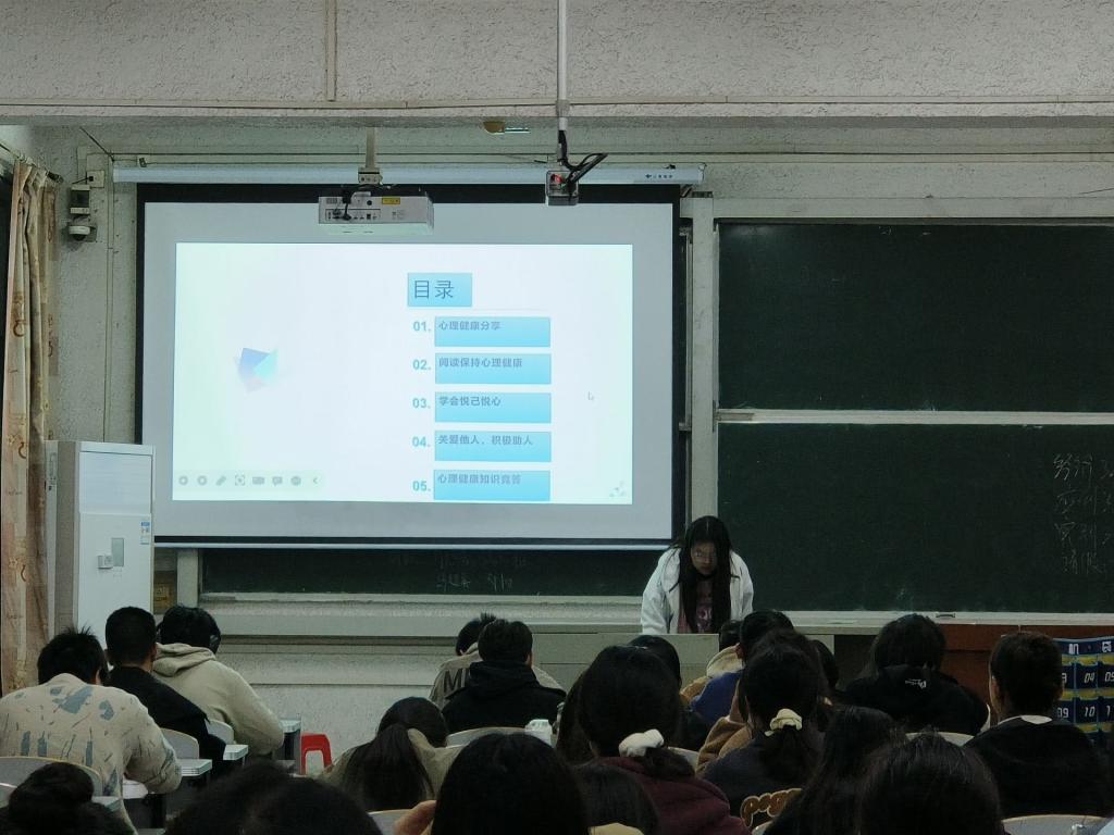 首先,心委和同学们一起学习了解心理健康的意义,认识心理健康的重要性。接着,她们向同学们介绍阅读的意义,通过观看相关心理健康教育短视频,探讨交流目前互联网上较热的“精神内耗”话题,告诉同学们:也许我们并不完美,但我们都在努力向前。呼吁同学们在最好的年华要多读书,因为读书可以让我们获取知识与技能、拓宽视野、充实头脑、治愈心灵,懂得悦纳自己,学会帮助他人。班会最后,为检验学习效果,心委组织同学们进行心理健康知识竞答,同学们踊跃发言,现场气氛热烈。