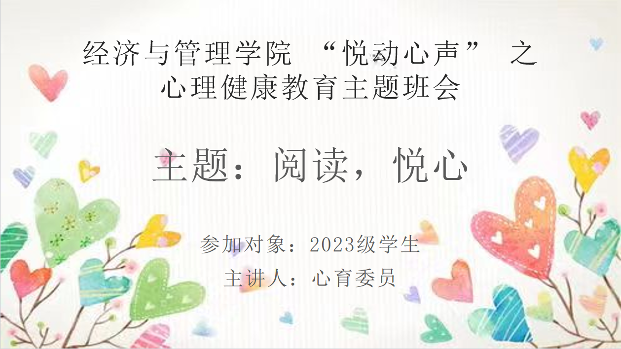 (通讯员 梁琴年)为营造浓郁的读书学习氛围,帮助学生进一步掌握心理健康知识,增强学生的心理健康意识,2023年11月23日,学院组织2023级学生开展主题为“阅读,悦心”的心理健康教育班会。本次班会由各班级心育委员主讲,全体学生到会参加。