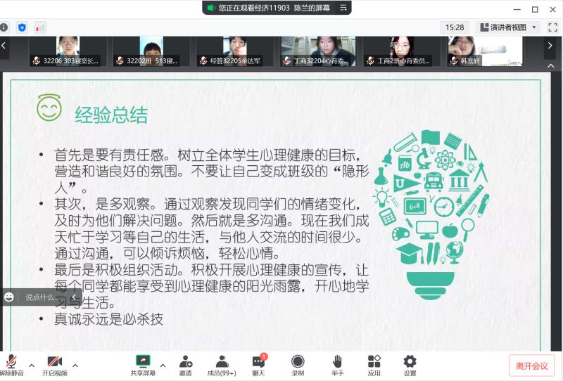 疫情封校中的大学生,你是否还在为不知如何开展心育活动而烦恼?你是否还在因无法走进同学内心而头痛?你是否还不清楚如何履行心理骨干之责任?针对这些疑问与困惑,经济11903班心育委员陈兰结合自身的学习与工作经历,围绕“心交流、心陪伴、心互助”与新生骨干展开分享。首先,陈兰向同学们分享自己在班级组织开展的一系列心育工作,如关注同学动态,做好工作记录、坚持在班级群发送每天的早晚安心语,生日祝福,营造班级温暖友爱的氛围、带领同学们积极参加学习培训,掌握心理健康知识、组织班级同学召开心理健康主题班团会等。