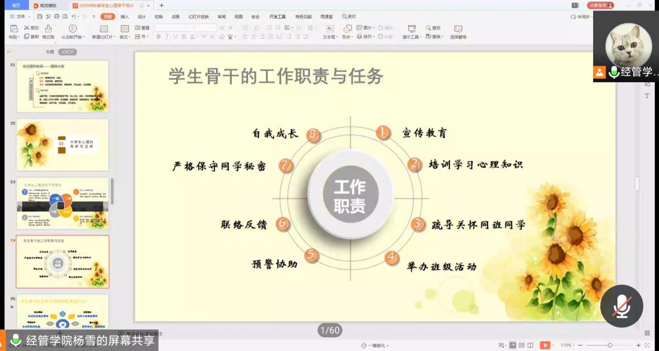 (通讯员:王巧)为进一步提高大学生心理素质,营造健康积极的心理教育氛围,9月22日--23日,经管学院通过腾讯会议方式,分三场开展了学院学生心理骨干培训。培训由学院学生心理专干杨雪老师主讲,学院各班级班长、团支书、心育委员、安全委员、寝室长等学生干部参加了本次培训。
