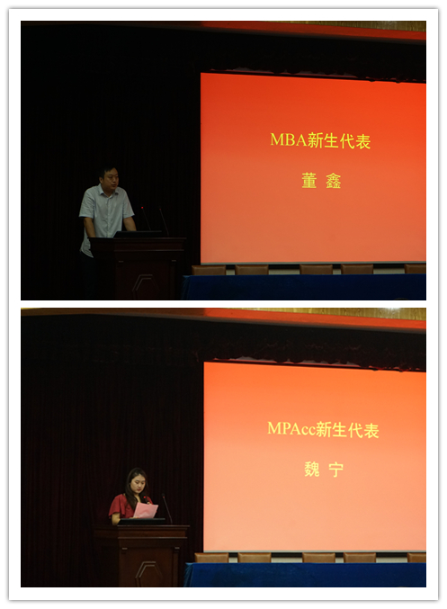 MBA新生代表董鑫在工作中感受到了“书到用时方恨少”,他认为前来深造学习是其不二的选择,他也定会做到不忘初心、砥砺前行,做到拥有创造力和责任感。MPAcc新生代表魏宁在工作中内心惶恐,担心自己会一直原地踏步,她用古语“博学之,审问之,慎思之,明辨之,笃行之”来激励自己和与同学共勉,希望不负所望,做到主动学习、不断探索。