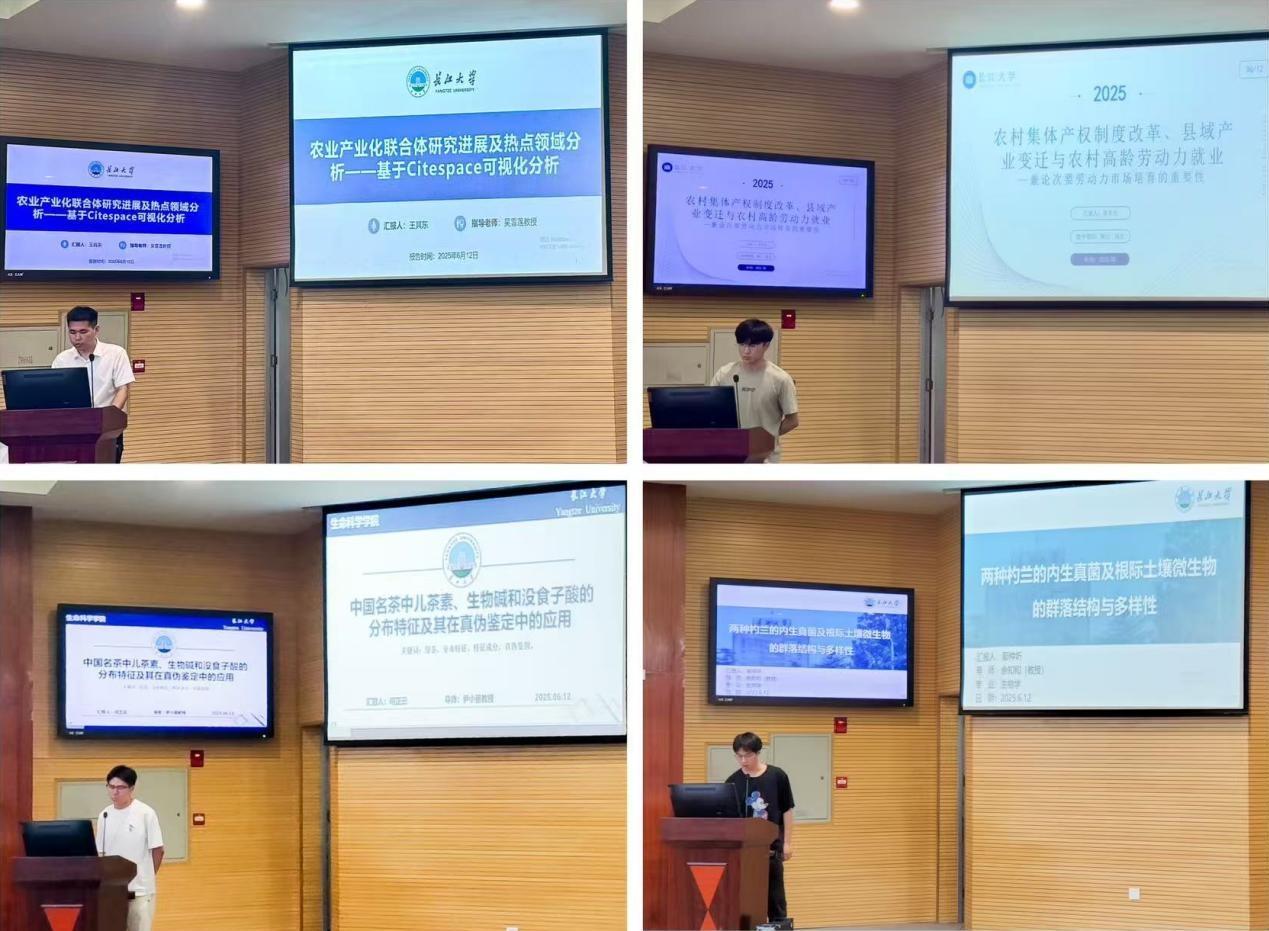 欧博abg官网登录入口的王其东和章非凡分别以《农业产业化联合体研究进展及热点领域分析——基于CiteSpace可视化分析》和《农村集体产权制度改革、县域产业变迁与农村高龄劳动力就业—兼论次要劳动力市场培育的重要性》为题,探讨了农业经济与农村发展的热点问题。生命科学学院的鄢仲圻和何正云则分别围绕《两种杓兰的内生真菌及根际土壤微生物的群落结构与多样性》和《中国名茶儿茶素、生物碱和没食子酸的分布特征及其在真伪鉴定中的应用》分享了他们的研究成果。