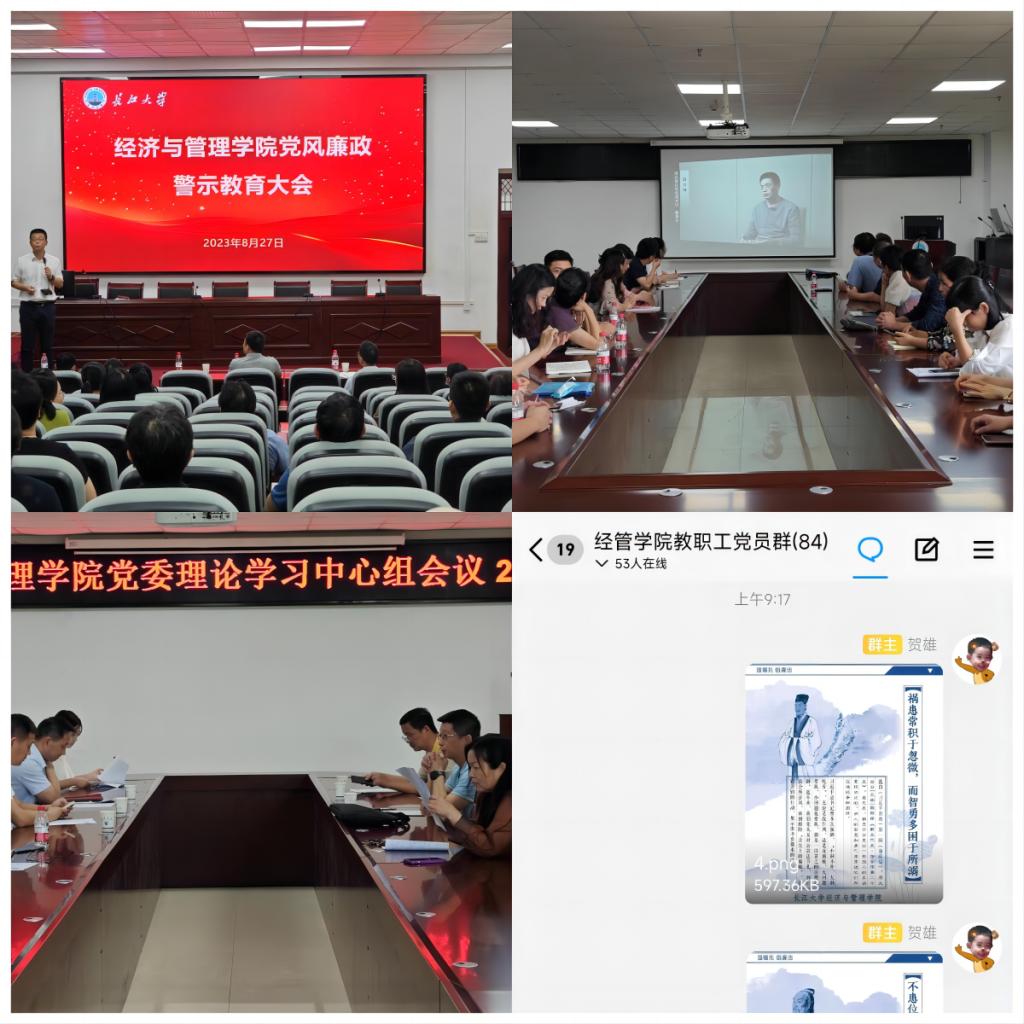 说案例、抓警示、学纪规,清风入人心。近期,欧博abg官网登录入口按照学校党风廉政宣教月的要求,聚焦“弘扬廉洁文化,创建清廉学院”的活动主题,精心谋划部署,扎实稳步推进,先后开展了经管学院党风廉政警示教育大会、讲授廉政党课、召开理论学习中心组专题学习会、家属廉政座谈会、集体观看警示教育片、制作推送党风廉政主题宣传海报等系列活动。