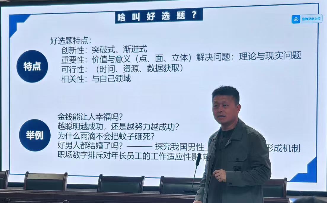 王华强教授以“如何做研究选题:以OBHRM方向为例”为主题,从什么是好选题、如何选好选题以及怎样推进研究三个层次逐步剖析,并以其课题申报书具体内容为例,向我们阐释了如何论证选题的价值与意义,为同学们提供了实用的论文选题与论证指导。